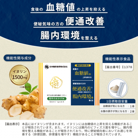 イヌリンには腸内のビフィズス菌を増やし、腸内環境を整える機能があることが報告されており、特に便秘傾向者においてお通じを改善する(排便回数、排便量を増やす)機能があることが報告されています。