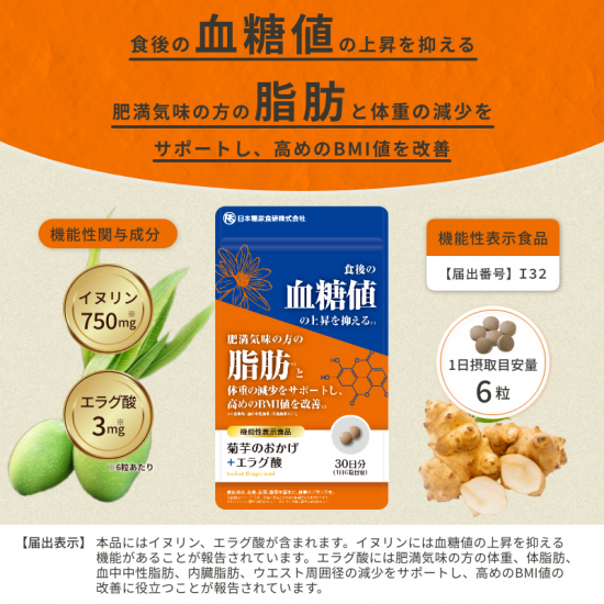■原材料:菊芋エキス末(ドイツ製造)、イヌリン(菊芋由来)、アフリカマンゴノキエキス(エラグ酸含有) /結晶セルロース、微粒二酸化ケイ素、ステアリン酸カルシウム