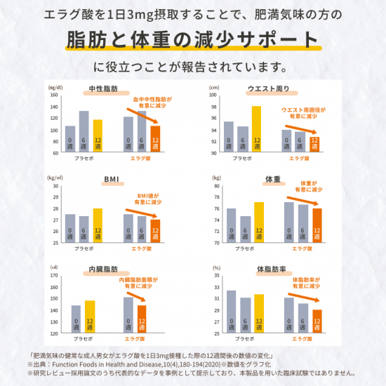 エラグ酸には肥満気味の方の体重、体脂肪、血中中性脂肪、内臓脂肪、ウエスト周囲径の減少をサポートし、高めBMI値の改善に役立つことが報告されています。